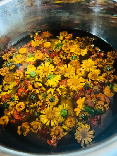Marigold is a reliable yellow-producer but also easy to push toward gold and brown with changes in pH or heat. Boiling any flower will change the color toward brown. To retain a brighter color, keep the heat just below a simmer, around 160 degrees Fahrenheit.
